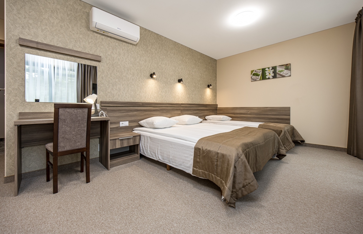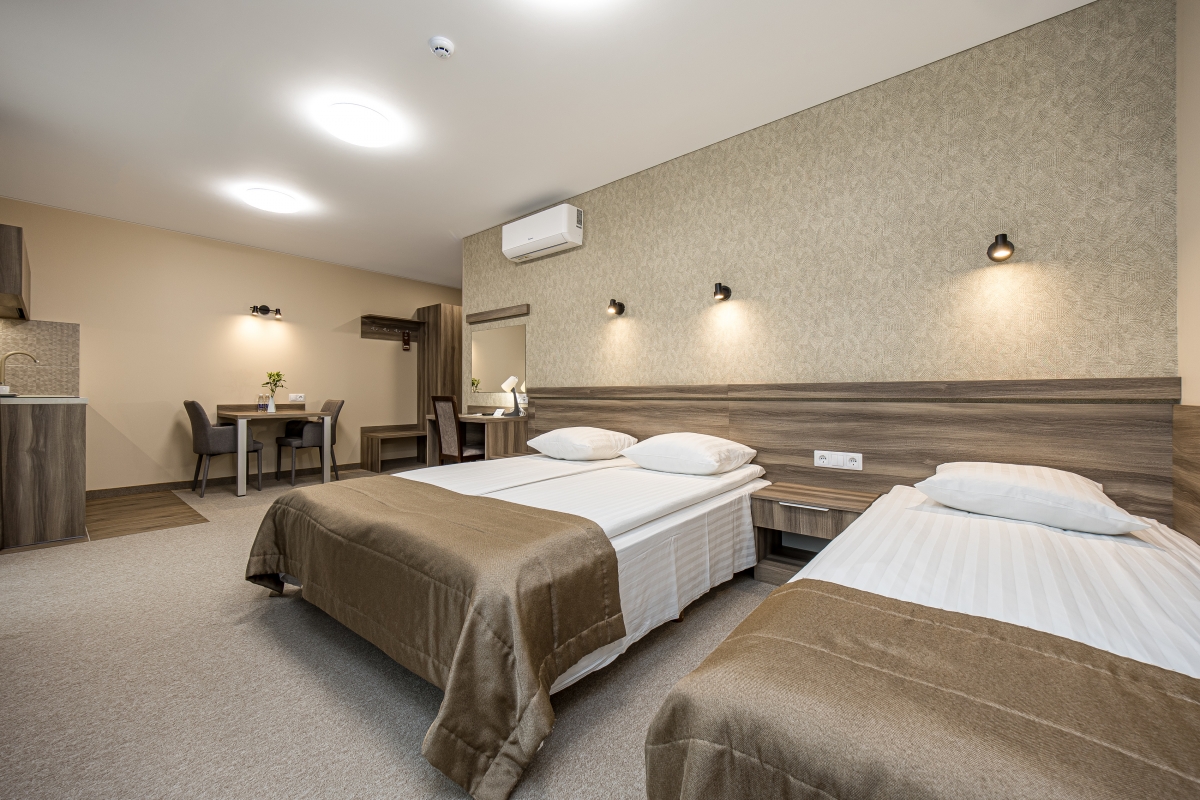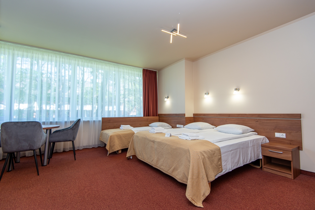 Trivietis kambarys Palangoje, viešbutyje „Žuvėdra“, yra puikus pasirinkimas norintiems atostogauti kartu su šeima. Kambaryje yra viena dvigulė ir viena papildoma lova, tad puikiai tiks šeimai ar draugams. Taip pat čia yra rašomasis stalas, oro kondicionierius, televizorius, veikia nemokamas internetas. Be to, triviečiame kambaryje rasite ir mini virtuvėlę.