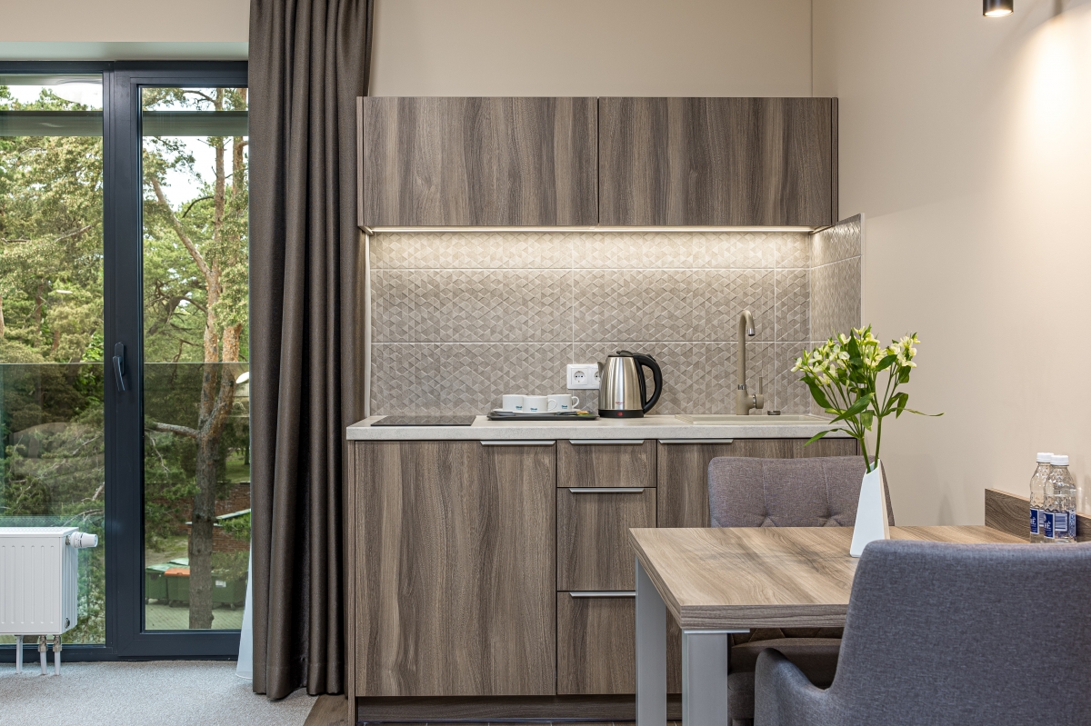 Kambarys su virtuve Palangoje – puikus pasirinkimas mėgstantiems gaminti. Patogioje nedidelėje virtuvėje rasite viską, ko prireiks maisto gamybai: virdulį, šaldytuvą, kaitlentę, reikiamus indus ir įrankius, puodus, keptuvę. Jums beliks pasirūpinti norimais ingredientais ir galėsite mėgautis pasakišku maistu tiesiog savo kambaryje.